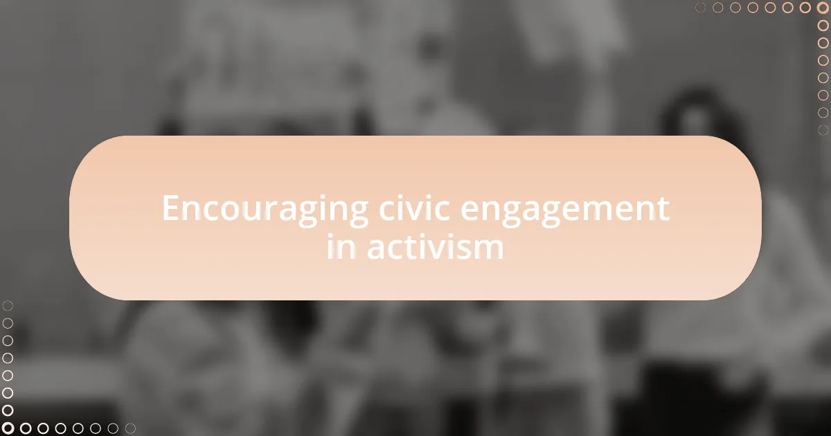 Civic engagement is the lifeblood of activism, and I’ve seen firsthand how small actions can lead to significant shifts. For instance, I once attended a town hall meeting where community members shared personal stories about the impact of war on their families. Witnessing their passion and determination reminded me that when citizens feel empowered to share their experiences, it ignites a collective purpose that can drive change. Isn’t it inspiring to think about the stories we each carry and how they can fuel a movement?